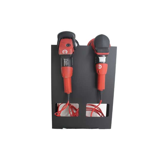 Wieszak bezpiecznie pomieści dwie maszyny polerskie, w ciekawy sposób ukrywając ich kable w specjalnym schowku. Wykonany z bardzo wysokiej jakości wytrzymałej stali, precyzyjnie wycięty i wygięty, finalnie pokryty proszkowym wykończeniem, zarówno wewnątrz jak i zewnątrz, aby zapewnić dodatkową warstwę ochronną przed utlenianiem.