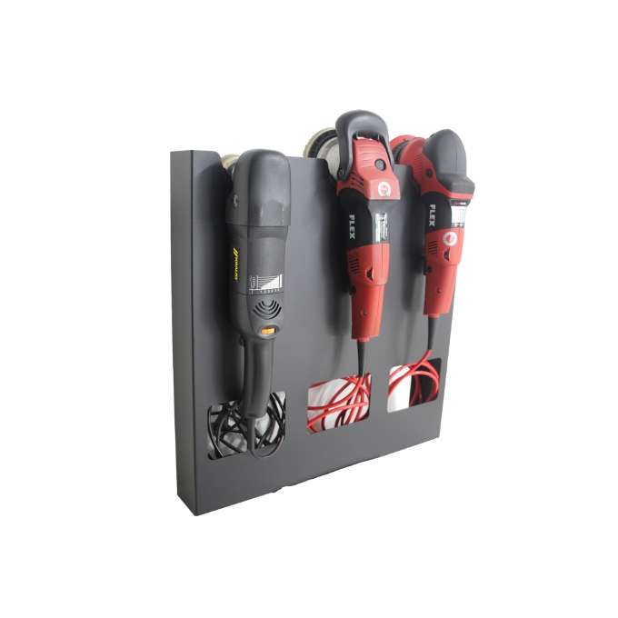 Nasz wieszak może bezpiecznie pomieścić dwie maszyny polerskie, ukrywając ich kable w specjalnym schowku. Wykonany z wysokiej jakości wytrzymałej stali, precyzyjnie wycięty i wygięty, finalnie pokryty proszkowym wykończeniem, zarówno wewnątrz jak i zewnątrz, aby zapewnić dodatkową warstwę ochronną przed utlenianiem.
